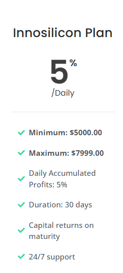 | Innosilicon Investment Plan | "$5000", "$5500", "$5800", "$6000", "$6500", "$6800", "$7000", "$7500", "$7999" |